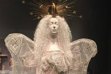 "Muchos de los diseñadores ya no practican (su religión), pero sin embargo la idea del catolicismo ha tenido un gran impacto en su imaginación", dijo Bolton. "A veces es provocación, a veces es adulación, otras veces solo nostalgia por un momento en su infancia". Hay virginales vestidos de novia de Chanel, Balenciaga y Dior, chaquetas de cuentas y crucifijos de Gianni Versace que imitan mosaicos, un extravagante ángel alado de Alexander McQueen y un conjunto brocado de seda de Yves Saint Laurent hecho para cubrir una estatua de la Virgen en una iglesia parisina.