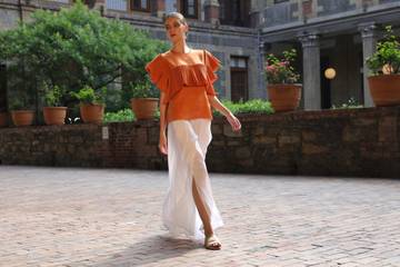 Para rendir homenaje a México, la colección se basa en el “patronaje tradicional y cuadrático que resuelve la construcción con rectángulos y cuadrados”. Por otro lado, resalta la influencia europea en los detalles que adornan las prendas, como fruncidos, alforzas y plisados.