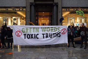 “Aprovechando la cumbre del clima COP25, las grandes marcas internacionales de moda exhiben el compromiso ambiental de ‘actuar ya’”, compromiso que “no podía ser más fingido”, declaraba el propio colectivo Extinction Rebellion Spain a través de su página de Facebook una vez terminada la protesta. Un acto en el que “30 rebeldes hemos irrumpido en Zara y nueve nos hemos adherido al escaparate, junto a los carteles de COP25 con los que la marca anuncia su falso compromiso medioambiental”, mientras que también “hemos instalado carteles que muestran, con datos reales, que la industria de la moda rápida es el segundo sector de actividad más contaminante del planeta”. “El sector empresarial no puede seguir evadiendo su responsabilidad en la crisis climática y ecológica. No al greenwashing”.