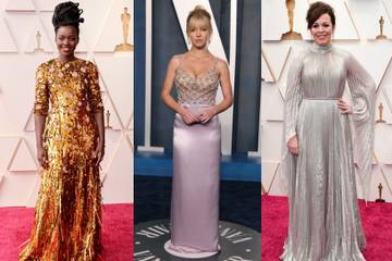 Lupita Nyong'o lució un vestido acampanado de Prada en color amarillo, cuya tela estaba adornada con lentejuelas y piedras preciosas. Olivia Colman llevó un vestido largo y plateado de Dior Couture con numerosos pliegues pequeños y mangas largas y anchas que aportaban volumen.