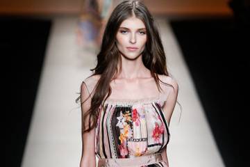 El próximo verano será cálido también para Byblos, que propone una colección a la vez muy femenina y deportiva. Faldas y vestidos de tirantes con volantes en un juego de aberturas. La casa juega con los contrastes en blanco y negro, y diseños geométricos de tela de araña. Los típicos motivos étnicos dominan también la colección, que se completa con conjuntos más deportivos de chalecos en cuero y pantalones amplios, al estilo del jogging._ Por Federica Andreol, AFP_