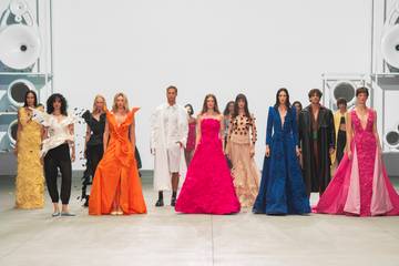 Entre las siluetas de esta colección, los conjuntos y vestidos entallan la figura femenina. La diseñadora resaltó las curvas a través de cuellos en “v” y cortes acinturados. Pero también jugó con grandes volúmenes y texturas, como vestidos cubiertos completamente con aplicaciones de flores, así como largas caudas que se le agregaron a mini faldas o incluso a sacos.