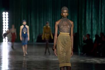 Terminando de profundizar en las singularidades de esta colección, como piezas clave, nos encontramos con las ya señaladas, como las faldas lápiz, las blusas con lazadas, las chaquetas de corte trapecio con espalda ancha, o con esas nuevas versiones de esmoquin para mujer. Piezas clave que comparten protagonismo con otras igualmente destacables, como los diferentes modelos de vestidos cortos; los de vestidos con detalles en fruncidos; con tops de cuello “halter”; o con los espectaculares, e igualmente provocativos, vestidos con fruncido en forma de dunas. Piezas, a excepción de los blazers y de los esmóquines, transparentes, frágiles y etéreas, que se mostraron combinadas con bragas opacas en acabado nude, y frente a las que terminaron de poner una tenue nota de oposición las rotundas prendas de abrigo en acabado efecto pelo y de línea armadura, así como los modelos de vestido que, aún siendo opacos, volvían a incidir en la desnudez de la mujer como una herramienta de empoderamiento. Acción para la que Vaccarello no ha dudado en deconstruirlos en ligueros, anudando los vestidos a esas mismas medias cuya seda y transparencia se han descubierto como las absolutas protagonistas de esta colección.
