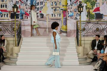 También combinó calcetines altos a rayas y tacones de aguja, un 'look' que puede "recordar a Emily en París", subrayó el diseñador, en referencia a las elecciones de ropa, a veces atrevidas, de la heroína de la serie de Netflix.