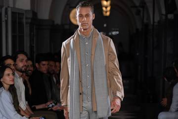 Los modelos lucieron abrigos con hombros suaves, pantalones de caída limpia, chaquetas de Teba, camisas ligeras, playeras tipo polo y prendas de punto. Los suéteres gruesos son una constante en la colección, algunos cerrados y de cuello alto, y otros con cuello en V abotonados al frente.