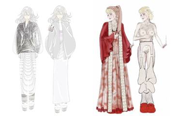 Aludiendo a la necesidad del personaje para ocultar su vejez, los looks constan de varias capas que funcionalmente nos permiten jugar con las prendas y crear múltiples looks totalmente diferentes que les dan más vida. Además, varias de ellas son ajustables y transformables, como es el caso de las faldas y ligueros con medias de mohair debajo.