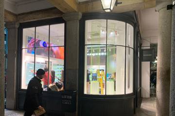Ubicada de cara a la West Piazza, centro neurálgico del mercado, el establecimiento sigue la línea minimalista en cuanto a diseño interior que tanto caracteriza a los establecimientos de la firma. Empleando en este caso para su materialización materiales tan limpios como el mármol blanco o el aluminio, que entran en fuerte contraste frente a la pared oscura que sirve de expositor y los destellos neón de diferentes elementos decorativos. En su interior, como en el resto de sus establecimientos, podremos encontrar toda la oferta de productos de las distintas marcas del grupo, que engloba desde las últimas novedades de Hawkers, a las de sus otras marcas Northweek, Wolfnoir y Miss Hamptoms. Así como sus colaboraciones especiales, como la desarrollada junto a Paula Echevarría o “Sensory Collection”, colección de 8 siluetas “retrofuturistas” de inspiración años 80.