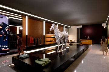 El local comercial cuenta con acabados de acero, paneles de cuero, piel de becerro y revestimientos de paredes a medida. En las instalaciones se destacan exhibidores de madera petrificada, un zócalo de exhibición de raíz de árbol, estanterías de acrílico retroiluminadas, columnas de acero y la escultura de un caballo de acrílico transparente iluminado en el centro de la tienda, que fue traída desde Argentina.